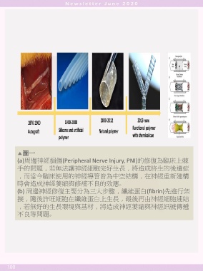 ▲圖一 (a)周邊神經損傷(Peripheral Nerve Injury, PNI)的修復為臨床上棘 手的問題,若無法讓神經細胞完好生長,將造成終生的後遺症 ,而當今臨床使用的神經導管皆為中空結構,在神經重新建構 時會造成神經萎縮與修補不良的效應。 (b) 周邊神經修復主要分為三大步驟,纖維蛋白(fibrin)先進行架 接,隨後許旺細胞在纖維蛋白上生長,最後再由神經細胞連結 ,若無好的生長環境與基材,將造成神經萎縮與神經訊號傳遞 不良等問題。 100