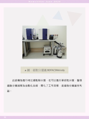 ▲ 圖:細胞分選儀 BDFACSMelody 此設備為進行特定細胞群分選,也可以進行單細胞分選,整個 細胞分選過程為自動化技術,簡化了工作流程,是細胞分選最佳利 器。 36