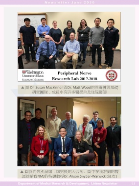 ▲ 圖 Dr. Susan Mackinnon與Dr. Matt Wood的周邊神經基礎 研究團隊,成員中有許多醫學生及住院醫師 ▲ 圖我的告別演講,講完後的大合照。圖中在我右側的醫 師就是我NMJ的指導教授Dr. Alison Snyder-Warwick (紅衣) Department of Medical Research & Development, Linkou Newsletter 53