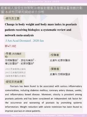 乾癬病人接受生物製劑治療後對體重及身體質量指數的影