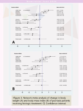 A B •Figure 3. Network meta-analysis of change in body weight (A) and body mass index (B) of psoriasis patients receiving biologic treatment. CI, Confidence interval. Department of Medical Research & Development, Linkou Newsletter 67