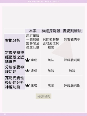本案 神經探測器 視覺判斷法 能定量每 客觀分析 一個觀察 只能觀察是 無客觀標準 點時間及 否收縮或其 強度反應 強度 定義受損神 經區段之近 達成 無法 評經驗判斷 端邊界 分析感覺神 經功能 達成 無法 無法 瓦勒氏變性 後仍能分析 達成 無法 評經驗判斷 神經功能 ▲技術優勢 96