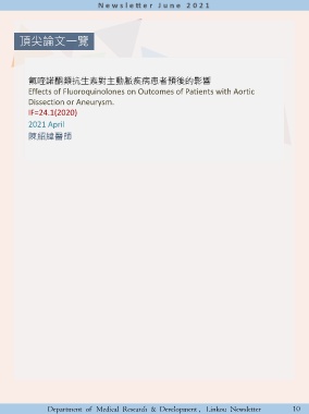 頂尖論文一覽 氟喹諾酮類抗生素對主動脈疾病患者預後的影響 Effects of Fluoroquinolones on Outcomes of Patients with Aortic Dissection or Aneurysm. IF=24.1(2020) 2021 April 陳紹緯醫師 Department of Medical Research & Development , Linkou Newsletter 10