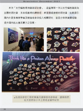 本次「太空輻射環境驗測研討會」,是臺灣第一次以太空輻射驗測為 主題的研討會,未來規劃將持續辦理,希望透過這樣的研討會,能夠吸引 國內外更多專家學者及製造商參與投入相關研究,並且分享其寶貴經驗, 提升國內航太產業實力之發展。 ▲為增添參訪行程的豐富及讓學員有參與感,讓學員們 在太空造型小卡上簽名並留作紀念 38