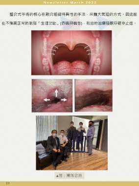 整合式手術的核心在融合組織特異性的手法,來擴大氣道的方式。因此能 在不傷害正常的咽部「生理功能」(吞嚥與構音),有效的治療睡眠呼吸中止症。 ▲圖:團隊合照 10