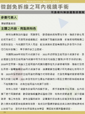 術,2020年發表創新全經耳道的兩種方式移除骨瘤,也發表異種材質修補耳膜