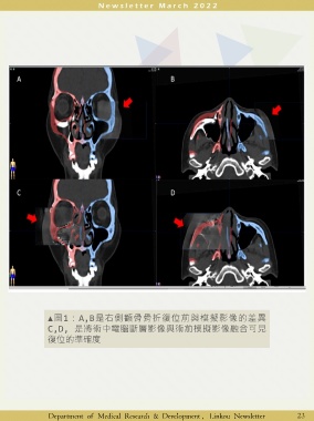 ▲圖1:A,B是右側顴骨骨折復位前與模擬影像的差異 C,D, 是將術中電腦斷層影像與術前模擬影像融合可見 復位的準確度 Department of Medical Research & Development , Linkou Newsletter 23