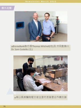 照片花絮 ▲BiomeBank執行長Thomas Mitchell(右)及 共同創辦人 Dr. Sam Costello (左) ▲林口長庚醫院程文俊主委代表簽署合作備忘錄 54