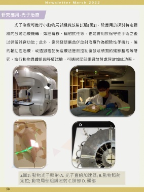研究應用-光子治療 光子治療可進行小動物局部組織放射試驗(圖2),除應用於探討特定腫 瘤的放射治療機轉,如癌轉移、輻射抗性等,也能併用於保守性手術之後 以保留器官功能;此外,像開發新藥合併放射治療作為根除性手術前、後 的輔助性治療,或透過搭配免疫療法進而控制復發或頑固的殘餘腫瘤等研 究。進行動物異體組織移植試驗,可透過局部組織放射處理增加成功率。 A B C D ▲圖2: 動物光子照射-A. 光子直線加速器; B.動物照射 定位; 動物局部組織照射 C.肺部 D. 頭部 58