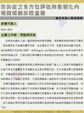 ,發揮及重建鼻腔功能。情緒評估方面也發表首篇證明空鼻症之情緒症狀,明