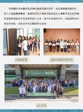 長庚醫院非常重視免疫學的基礎與臨床研究,為促進醫療品質提升, 更大力推動轉譯醫學,藉著新研究大樓與尖端免疫核心實驗室成立的契機, 希望積極與國內外免疫學者進行交流,提升免疫學的研究,促進國際合作, 與世界接軌,成為世界免疫醫學研究重鎮。 ▲海報展覽 ▲論文競賽活動頒獎 ▲大合照 Department of Medical Research & Development , Linkou Newsletter 41