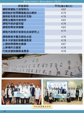 評值項目 平均(滿分為5分) 講師表達能力清楚明白 4.83 講師能針對問題重點加以解析 4.79 講師能和學員有良好互動 4.78 課程主題與內容相符 4.83 課程內容詳盡完整 4.78 課程時間安排適量 4.83 課程內容易於銜接在自身研究上 4.74 課程簡報字體及顏色合宜 4.78 對本次研習的整體滿意度 4.78 上課時間規劃合適度 4.87 上課場所合適度 4.78 行政支援與服務滿意度 4.78 44