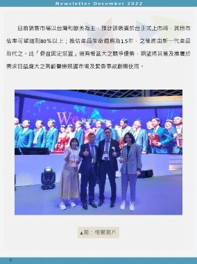 目前銷售市場以台灣和歐美為主,預計該裝置於台正式上市時,其他市 佔率可望達到80%以上;推估產品生命週期為1.5年,之後將由新一代產品 取代之。此「骨盆固定裝置」擁有相當大之競爭優勢,期望將其普及推廣於 需求日益龐大之高齡醫療照護市場及緊急事故創傷使用。 ▲圖:相關圖片 6