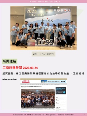 ▲圖:工作人員合照 新聞連結 工商時報新聞 2023.03.24 網頁連結: 林口長庚醫院舉辦福爾摩沙免疫學校與會議 - 工商時報 (ctee.com.tw) Department of Medical Research & Development , Linkou Newsletter 15