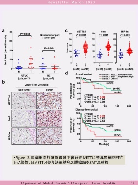 •Figure 2.腫瘤細胞於缺氧環境下會藉由METTL4誘導其細胞核內 6mA修飾;且METTL4參與缺氧誘發之腫瘤細胞EMT及轉移 Department of Medical Research & Development , Linkou Newsletter 31
