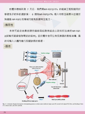 在體外機械刺激 7 天后,我們將MY-FGF2/rTFs 的組織工程肌腱用於 修復兔子的伸肌腱缺損。 6 週後MY-FGF2/rTFs 植入物取出後顯示出優於 無細胞 MY-FGF2 的機械性能和肌腱再生能力。 ‣應用性 未來可結合病患自體的纖維母細胞來結合此研究所生產的MY-FGF- 2(綁辮式縫線增強電紡紗線束), 並於體外使用生物反應器的動態培養. 最 終可植入人體內進行肌腱缺損的修復。 ‣圖表 36