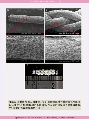 •Figure 2.覆蓋有 PCL 纖維(A 和 C)的縫合線增強單紗線(SY)和來 自三個 SY(B 和 D)編織的多紗線(MY)支架的掃描電子顯微鏡圖像。 MY 支架的光學圖像顯示在 (E) 中 Department of Medical Research & Development , Linkou Newsletter 37