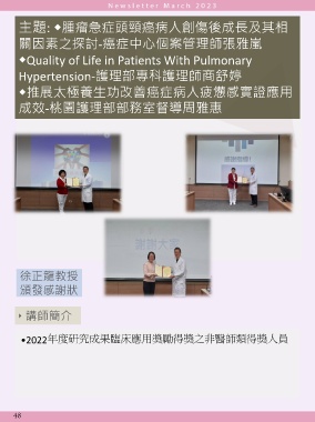 主題: ◆腫瘤急症頭頸癌病人創傷後成長及其相 關因素之探討-癌症中心個案管理師張雅嵐 ◆Quality of Life in Patients With Pulmonary Hypertension-護理部專科護理師商舒婷 ◆推展太極養生功改善癌症病人疲憊感實證應用 成效-桃園護理部部務室督導周雅惠 徐正龍教授 頒發感謝狀 ‣ 講師簡介 •2022 年度研究成果臨床應用獎勵得獎之非醫師類得獎人員 ‣ 2019.09.26 48