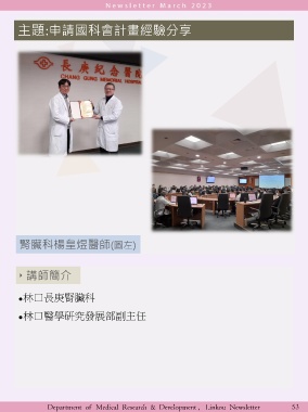 主題:申請國科會計畫經驗分享 腎臟科楊皇煜醫師(圖左) ‣ 講師簡介 • 林口長庚腎臟科 • 林口醫學研究發展部副主任 ‣ 2019.09.26 Department of Medical Research & Development , Linkou Newsletter 53
