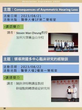 主題:Consequences of Asymmetric Hearing Loss 活 動 日 期 : 2023/08/21 活 動 地 點 : 醫 學 大 樓 1F第二簡報室 ‣講 師 簡 介 講者: Steven Wan Cheung 教授 加州大學舊金山分校 主題:領導跨國多中心臨床研究的經驗談 活 動 日 期 : 2023/08/22 活 動 地 點 : 醫 學 大 樓 2樓第一簡報室 ‣講 師 簡 介 講者:陳鈴津特聘講座教授 幹細胞與轉譯癌症研究所 38