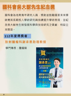 國科會吳大猷先生紀念獎 國科會為培育青年研究人員,獎助並鼓勵國家未來學 術菁英長期投入學術研究與持續提升學術表現,並紀 念吳大猷先生對發展科學與技術研究之貢獻,特設立 本獎項。 112年度得獎者 放射腫瘤科謝承恩助理教授 學門專長:腫瘤類 8