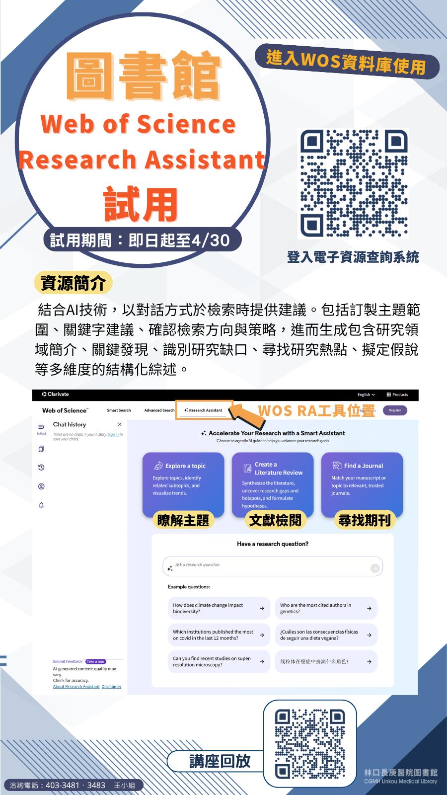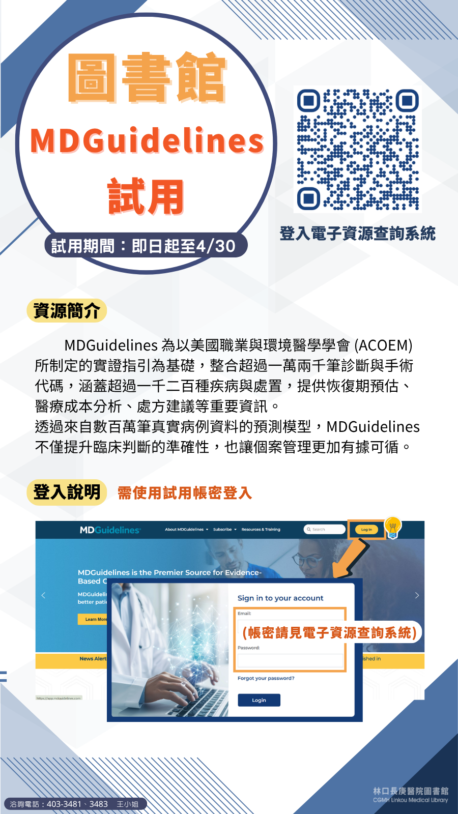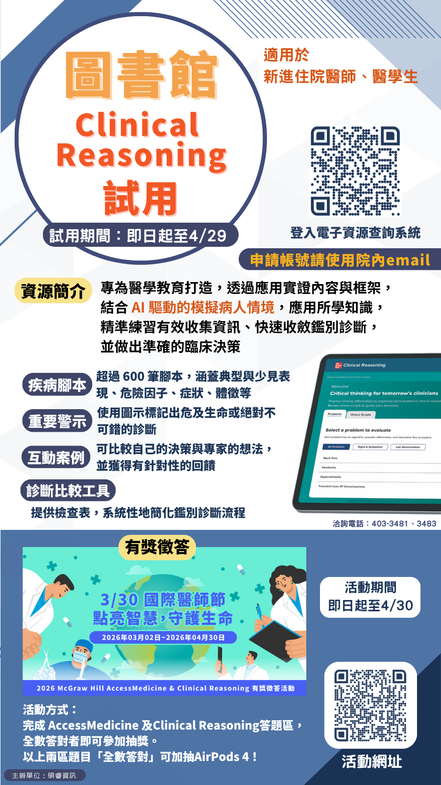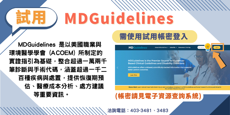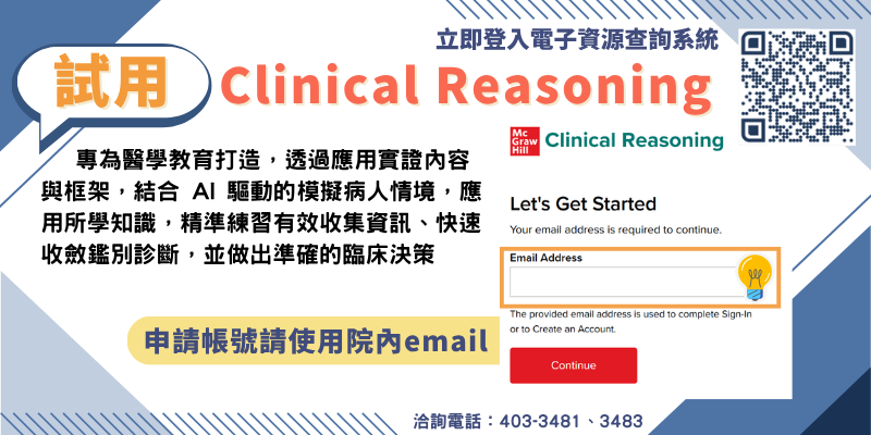 VisualDX、Clinical Reasoning、WOS RA、MDGuidelines資料庫即日起開放試用,歡迎多加利用