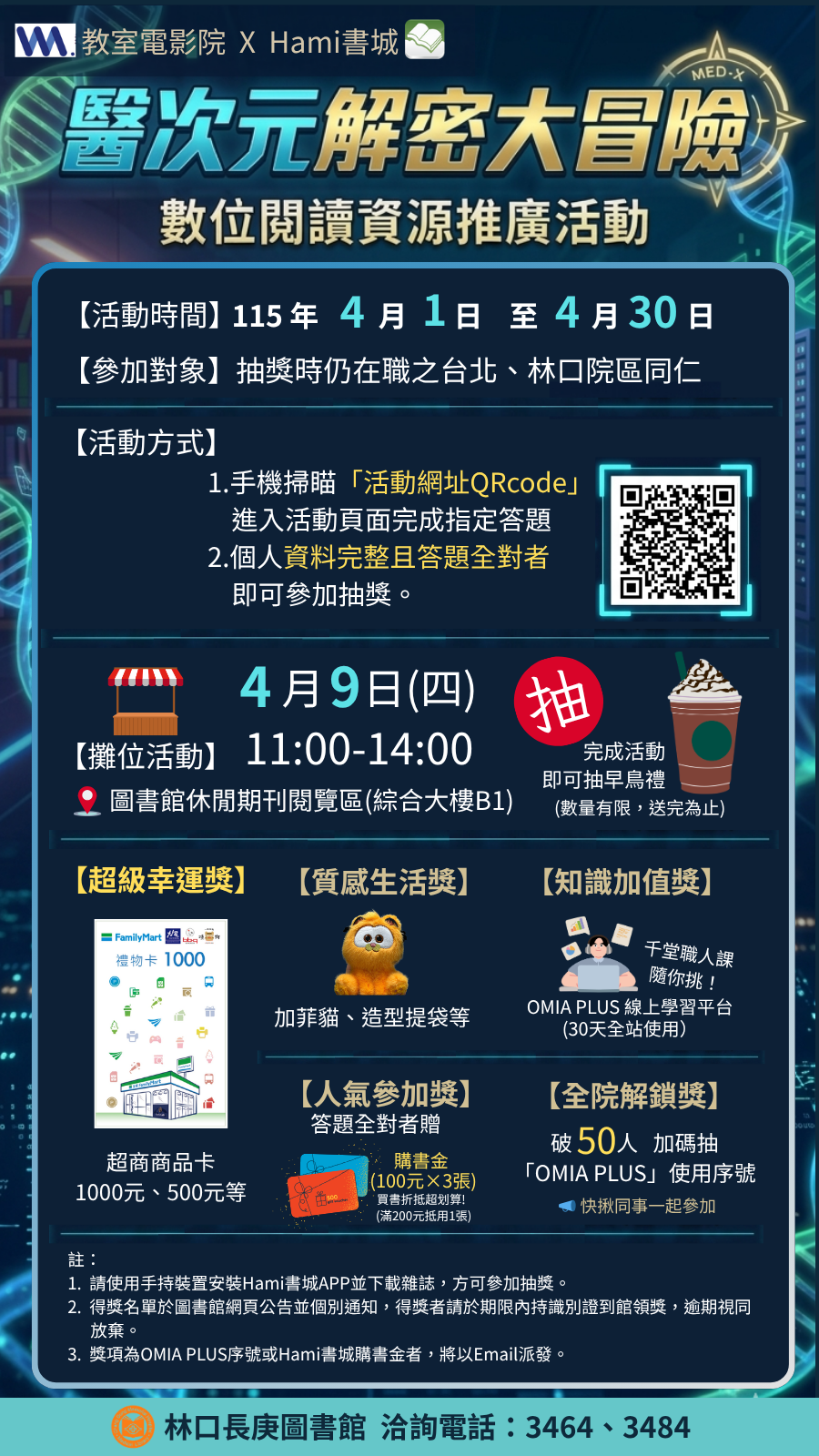 「醫次元解密大冒險:數位閱讀資源推廣」有獎徵答活動,多項好禮等你抽,歡迎同仁踴躍參加