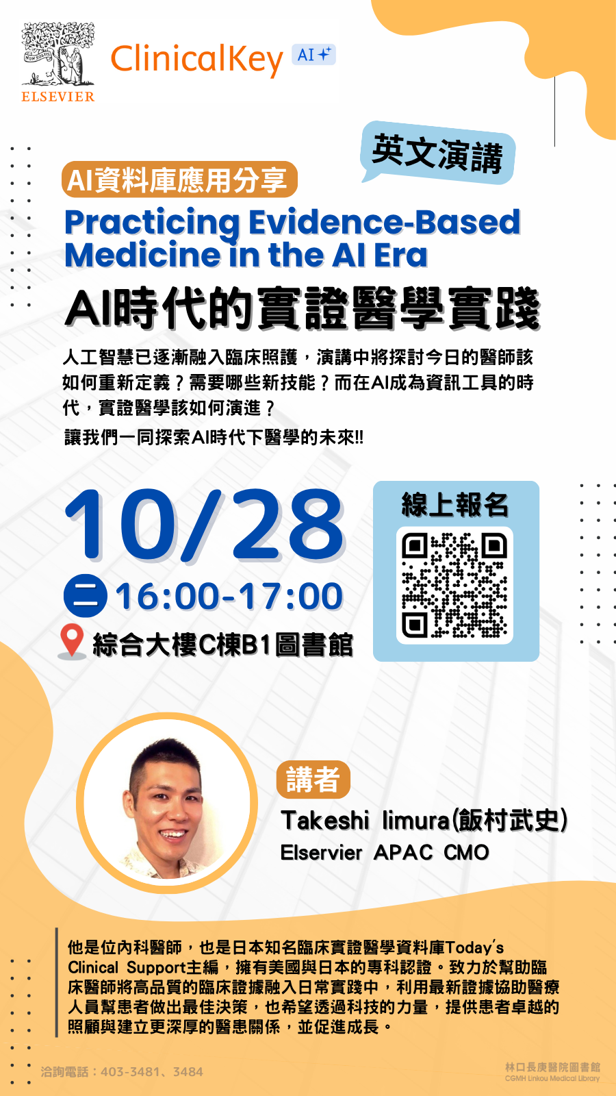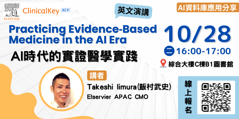 圖書館邀請Elservier APAC CMO 飯村武史分享AI時代,實證醫學該如何演進等內容,歡迎同仁至院內報名系統報名參加~~