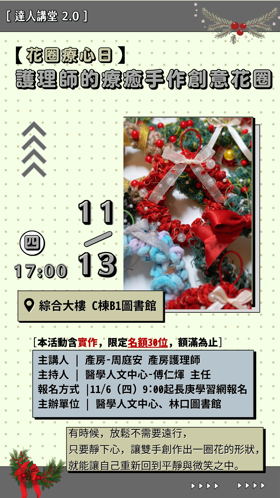 2025/11/13邀請產房周庭安護理師分享「花圈療心日:護理師的療癒手作創意花圈」,歡迎同仁踴躍參加~~