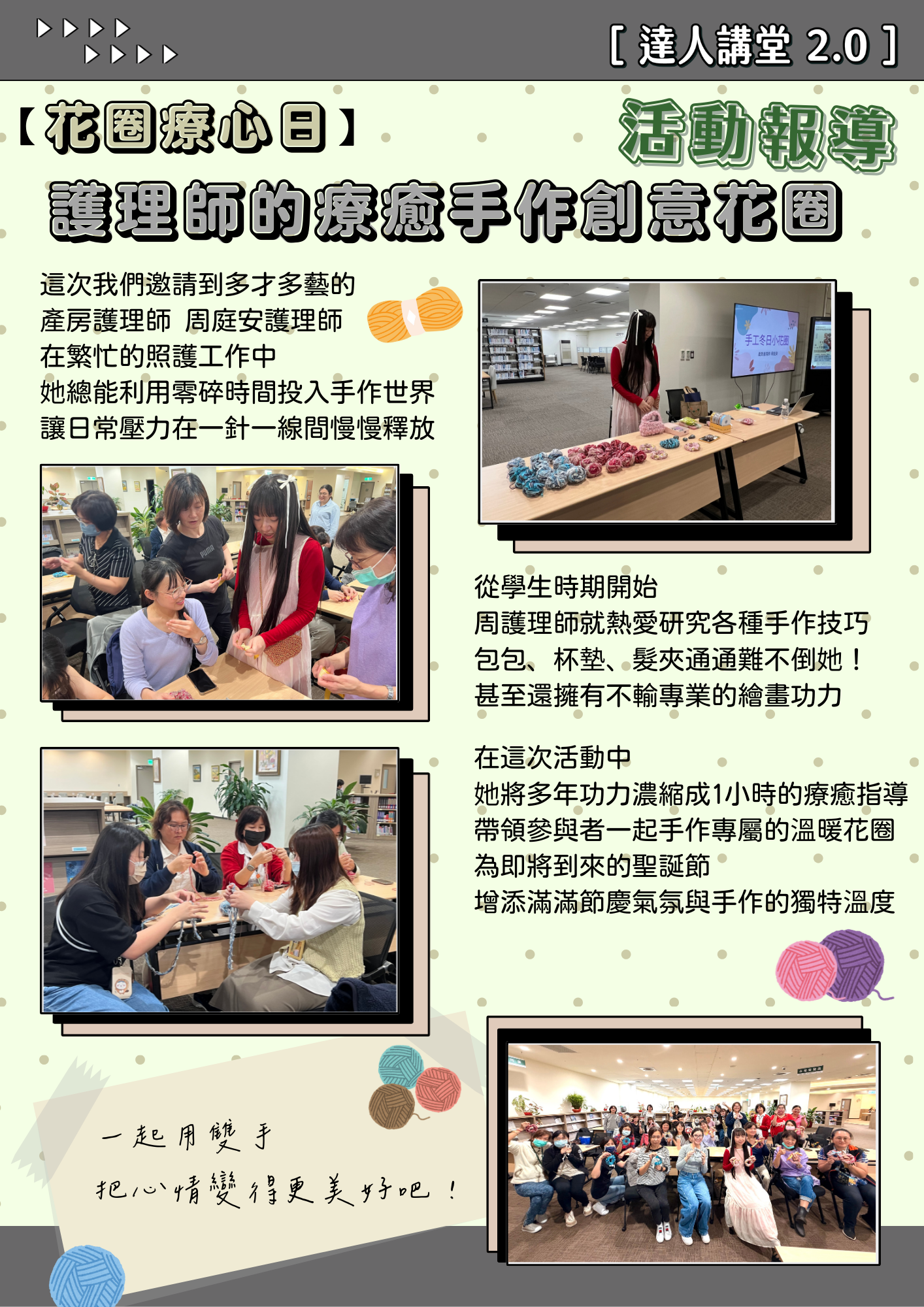 2025/11/13邀請產房周庭安護理師分享「花圈療心日:護理師的療癒手作創意花圈」,一起用雙手把心情變得更美好!