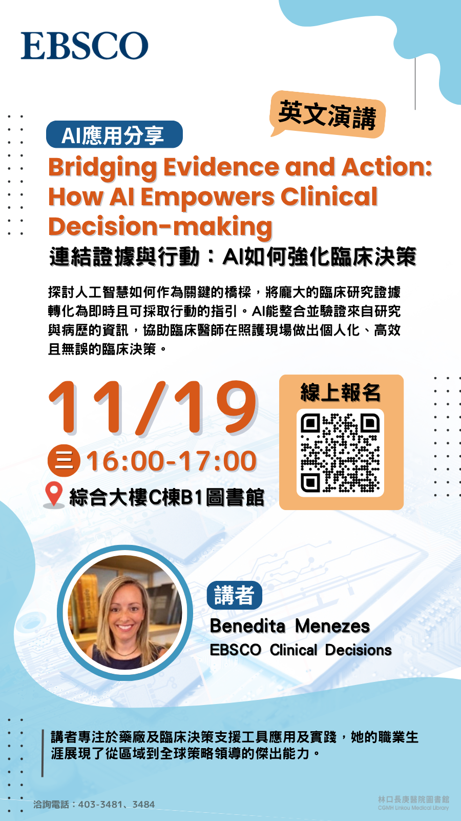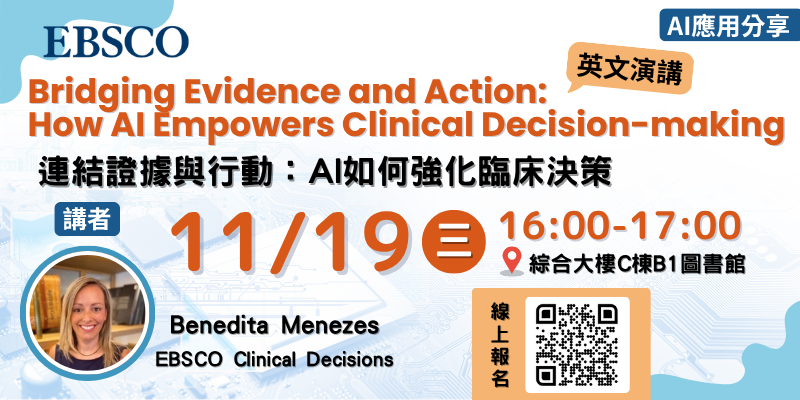 11月19日(三)16:00舉辦「AI應用分享:Bridging Evidence and Action」專題演講,歡迎同仁踴躍報名參加。