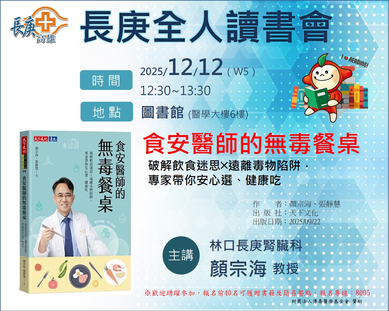 2025 年12月12日(五) 12:30-13:30 地點:圖書館 主題:食安醫師的無毒餐桌 |