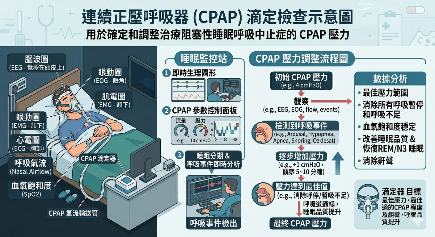 在睡眠中心配戴正壓呼吸器(CPAP)並連接多項睡眠生理檢查(PSG)設備 經由睡眠技師全程監控調整正壓呼吸器的壓力設定,尋找到最適合睡眠呼吸中止症患者的壓力設定值