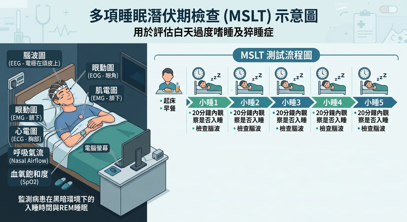 此項檢查需把檢查室的燈光調整如夜間睡眠時一樣,受檢 者躺上床之後,儘可能嘗試入睡,睡眠技師依照腦波的變化判定入睡 時間,目的為測量白天嗜睡的程度並監測快速動眼期開始的時間。