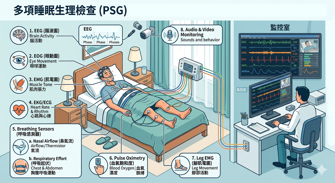 多項睡眠生理檢查乃是偵測病患睡眠過程中的腦波、鼻子與嘴巴之呼吸氣流、 心電圖、肌電圖、打鼾指數、血氧飽和指數、睡眠呼吸中止指數、胸腹呼吸用力 之變化、肢體活動與睡覺姿勢等的檢查,可確地診斷睡眠障礙之原因,瞭解睡 眠狀態以及睡眠相關的疾病,檢查時間約6-7小時,需留宿睡眠中心一夜